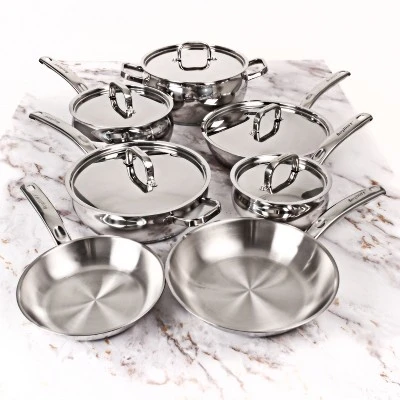 BergHOFF’s 18/10 Stainless Steel Belly Cookware Collection, elegant beauty that will last for years. Crafted from hygienic 18/10 stainless steel with a mirrored finish, this cookware shows off sleek curves that accent each piece giving this cookware a unique and attractive look. Professional quality cooking with effortless cleanup. The stainless steel lids allow you to cook more efficiently by securing heat inside. Our durable stainless steel cookware, designed with versatility and functionality in mind, is built to withstand a lifetime of use in the home. Ergonomic, double-riveted stainless steel handles provide a secure grip. High quality elements were put into every aspect of this cookware. The solid tri-ply base allows you to use on all cooktops including ceramic, gas, induction, electric, and glass. Please allow cookware to cool completely before attempting to clean. Dishwasher safe. Set includes: 6.25″ Saucepan 1.5qt., 8″ Saucepan 3.2qt., 9.5″ Stockpot 5.5qt., 9.5″ Deep Skillet, 8″ Frying pan, 9.5″ Frying pan, 10.5″ Skillet 2.5qt., 5x stainless steel lids