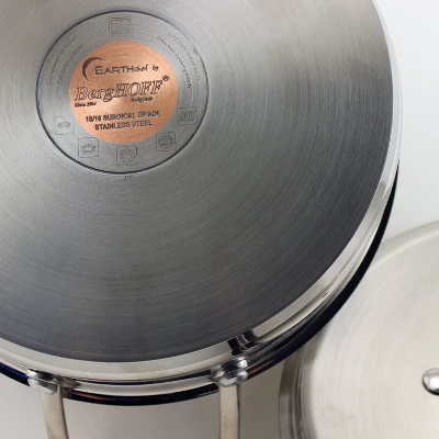 10″ Covered deep skillet is made with 18/10 Surgical Stainless steel on outer surface. Patented sandwich base with a copper core for fast and even heat distribution. Works on all cooktops, including induction.