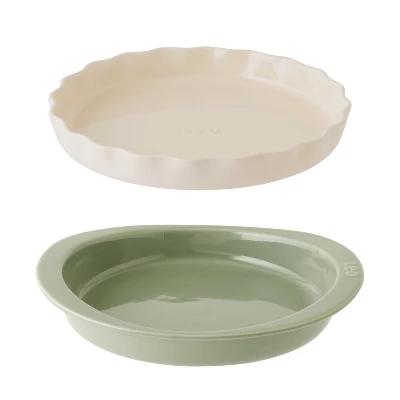 Leo Balance 2Pc Bakeware set is crafted from high-quality and durable non-porous ceramic ensures an even heat distribution. Whether you’re in the mood for a chicken pot pie or some freshly baked cinnamon rolls, just take out this round baking dish and slide it in the oven while the rippled pie dish is the ideal dish for savory pies, quiche, tarte tatin and many other tasty dishes. These dishes also hold the heat very well to keep your dish warm at the table and ensures that the food comes loose easily. thanks to the enamel coating, which also makes it easy to clean. The convenient handles on the side provides a good grip for safe handling and easy lifting. These dishes can be used in the microwave and oven safe up to 240°C (464°F). The Leo stoneware comes in different shapes and sizes! Perfect for those kitchen enthusiasts who want to put their skills to the test. This set includes 9.6” round baking dish 1.27qt., and rippled pie dish 11”.