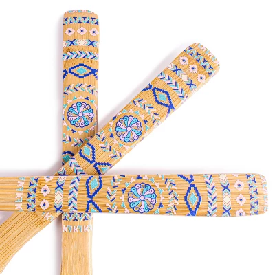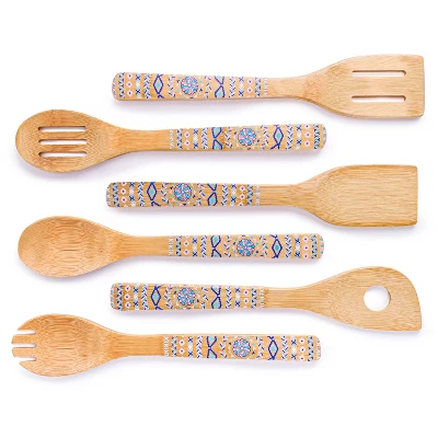 - Set includes bamboo 10″ Utensil/flatware caddy, 14″ Salad bowl, 4x Trivets, and 6x 12″Patterned utensils (Slotted Spatula, Spatula, Slotted Spoon, Serving Spoon, Spaghetti Spoon, Salad Spoon). Blue patterns on handles and trivets.