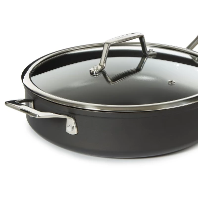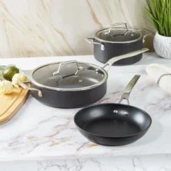 - HARD ANODIZED: This high-quality hard anodized pots and pans collection provides exceptional durability and superior heat distribution. Its aluminum body ensures a fast and even heat distribution for energy-efficient cooking. The long and ergonomic stainless steel handle not only prevents burns but also offers a safe and comfortable grip for secure lifting while the helper handle increases safety and support. Hanging loop that allows for easy storage and minimal kitchen space.