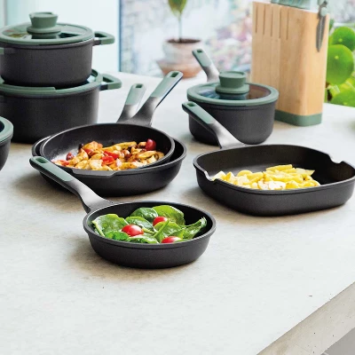 - FernoGreen NONSTICK COOKWARE: BergHOFF’s FernoGreen, 100% Non-Toxic and does not contain PFOA, GEN-X, BPA, APEO, NMP or PFOS for healthier no-oil or low oil cooking. Ideal for searing, browning, and adding charred flavor to various ingredients. Conducts heat fast and evenly for energy-efficient cooking.