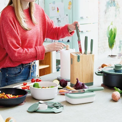 Want to jumpstart your knife collection? Then this Leo Forest Stainless Steel 6Pc Knife Block Set with built-in sharpener is the way to go! This versatile set contains a hand-sharpened stainless steel paring knife, utility knife, carving knife, bread knife and chef’s knife. In the beautiful wooden knife block you can conveniently keep all these knives organized and within reach for efficient food preparation. You can even keep your knives sharp with the built-in knife sharpener. It also integrated magnetic on the side of the block to store Forest scissors or any of your magnetic kitchen tools. These knives are crafted from high-quality stainless steel featuring a sleek satin finish. It boasts a construction of recycled PP and TPR, ensuring an ergonomic handle for a comfortable and secure grip. This set includes Chef knife 7.5″, Bread knife 9″, Carving knife 7.5″, Utility knife 4.5″, Paring knife 3.25″, Knife block 9″ x 7″ x 3″.