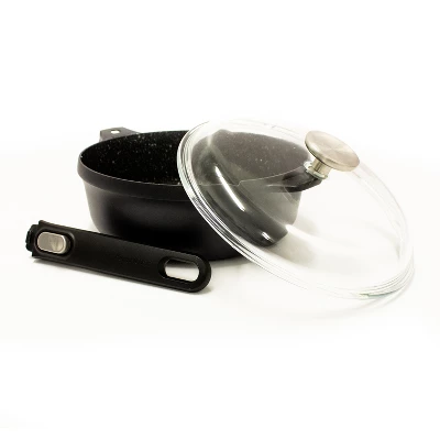 - Made of Non-stick Ferno-Green,PFOA Free coating Cast Aluminum. Easily detachable handle that allows for use in the oven and space-efficient storage. Stay-cool handle, Glass lid with silicone rim-dripless pouring.