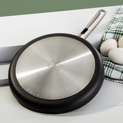 - CONSTRUCTION: Omelet Pan 10 inches, Graphite. Made from 100% recycled Aluminum equipped with high quality, sustainable and healthy CeraGreen non-stick ceramic coating. A full disk base of aluminum cookware ensures a fast and even heat distribution for energy-efficient cooking. The long and ergonomic shaped handle with large loop for a safe and comfortable grip for secure lifting.