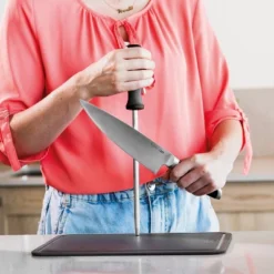 - CONSTRUCTION: Knife Sharpener Rod 8.5″, Graphite, Black. Crafted with precision, this tool combines a high-quality diamond grinding rod with an ergonomic handle made from PP and TPR. The carbon steel pole boasts a sandblasted exterior for enhanced durability.