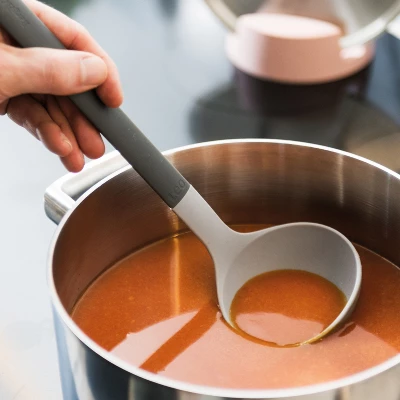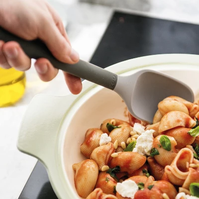 This utensil set is the perfect addition to any kitchen, its features all the must have tools and the soft gray color blends in perfectly with any kitchen. The heat-resistant silicone won’t scratch your delicate cookware while the soft-touch rubber handle ensures a comfortable grip when you’re scooping up your ingredients. When you’re done eating, just put them in the dishwasher and use the hanging loop for convenient storage. Set Includes: 12.75″ serving spoon, 12.25″ pasta spoon, 12.5″ serving ladle, 12.75″ skimmer and 11″ tongs.