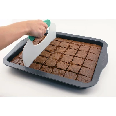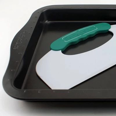 Cookie Sheet with tool is more than quality baking pans; It’s also a convenient cutting system. The unique patented guideline grid around the outer edges of every pan allows you to simply line up an exclusive Perfect Slice cutting tool, and press down to create any portion size desired. Every slice is beautifully uniform. The cutting tool with silicone handle is tough enough to cut the cake yet won’t damage your pan.