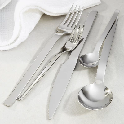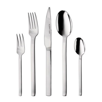 Designed by award-winning designer Ralph Krämer. Straightforward yet dynamic, the Essence flatware exudes a masculinity that stands out on the dinner table. With this set of cutlery designer Ralph Kraemer created precise and harmonious flatware that nicely balances rectangular surfaces with clear curves. It combines a sober design and technique, which results in a charming and attractive symmetry giving the cutlery a well-proportioned look. 30 Pc Essene design set is the epitome of elegance and style. We all know fashion trends are usually short-dated, but products and especially flatware needs to be timeless. Service for 6 guests. Package includes: 6x 8.75″ Knives, 6x 8.25″ Spoons, 6x 8.5″ Forks, 6x 6″ Cake Forks, 6x 5.75″ Coffee/Tea Spoon