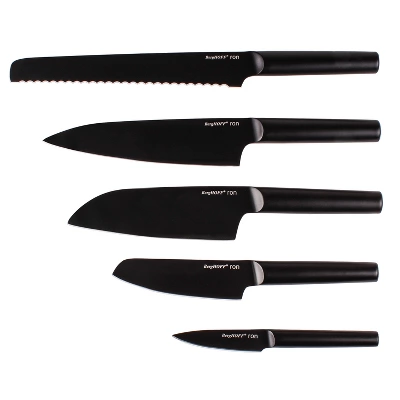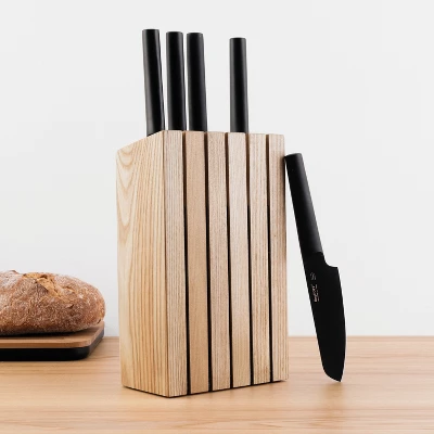 - With a full tang, corrosion resistant, and stain resistant construction, these knives are built to last. Each knife are equipped with a nonslip handle and a nonstick, healthy titanium PVD coating on the blade that boasts easy food release. The matching wooden knife block features an angled design, providing optimal protection for the blades while the large, well-distanced slots allow for easy removal of each knife.